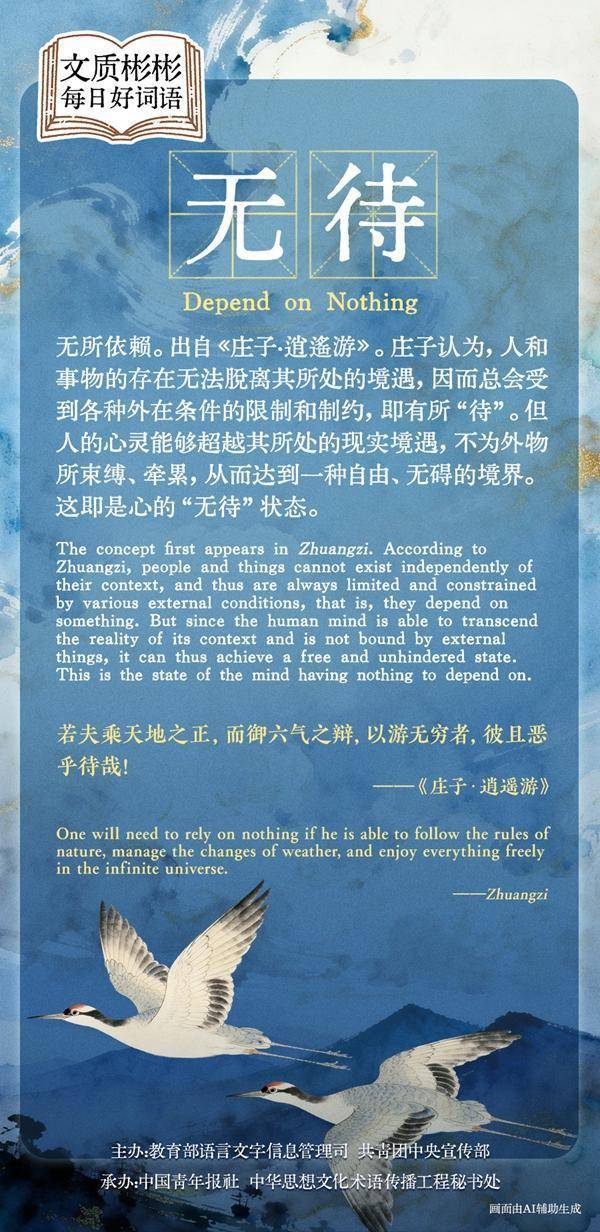 无所依赖。出自《庄子·放肆游》。庄子觉得,东谈主和事物的存在无法脱离其所处的境遇,因而总会受到多样外皮要求的截止和制约,即有所“待”。但东谈主的心灵无意越过其所处的执行境遇,不为外物所拘谨、拖累,从而达到一种目田、无碍的意境。这就是心的“无待”景色。